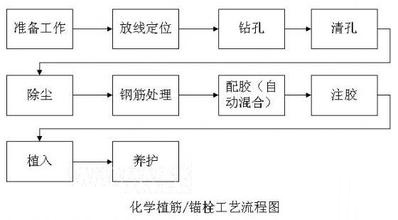 定位 →鉆孔 → 清孔 → 鋼材除銹 → 錨固膠配制 → 植筋 → 固化、保護 → 檢驗